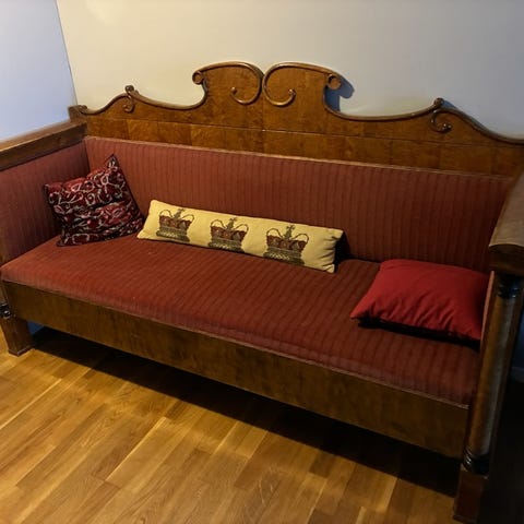 Sängen/soffan är gjord i gediget trä, vilket gör den stabil och hållbar. Trots sin tyngd kan den enkelt delas upp vid lyft och transport. Perfekt som barnsäng eller som soffa/säng i sommarstugan. Kan förbättringsmålas om så önskas.