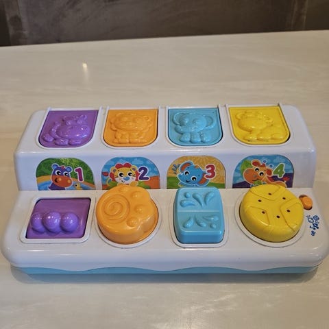 Barnleksaker bestående av olika frukt- och grönsaksformer i plast. Leksakerna kan användas för rollspel och lärande om mat och hälsa.