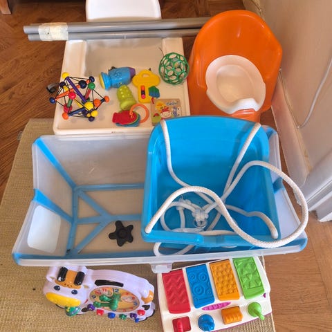 Cykelbarnstol 100kr. Bobby car 200kr. Lära gå stol 100kr. Hokus Pokus stol med dyna säkerhetslås 200kr. Barnkärra 160kr.