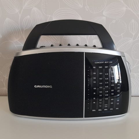 Grundig radio med bärhandtag.