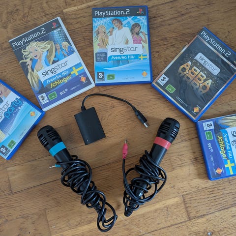 Sony PlayStation 2 spelpaket inklusive spel, två mikrofoner med kablar, styrdon och nödvändiga anslutningar. Passar för användning med PlayStation 2-konsolen.