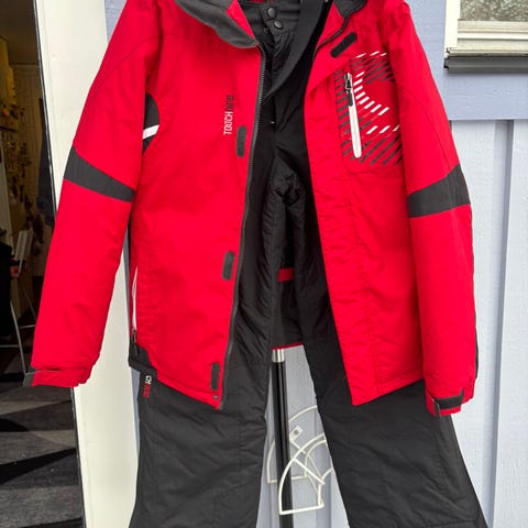 True North skidkläder set för barn i storlek 158 cm. Setet inkluderar jacka och byxor i vitt och grått mönster. Designat för nordiskt väder med funktionella egenskaper för vinteraktiviteter.