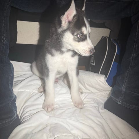 Huskyvalpar till salu. Hundarna känner varann så de säljes tillsammans och att köparen inte separerar dem. Priset är 10000 kr per valp. Den vita valpen är 10 månader, hane. Den svart, grå vita är 5 månader, tik.