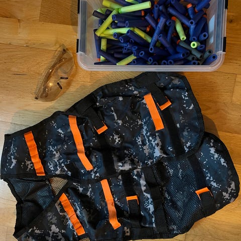 Säljer över 30 nerfs, magasin, massor av skott, sikten, handtagsgrepp, nerf väst samt glasögon
