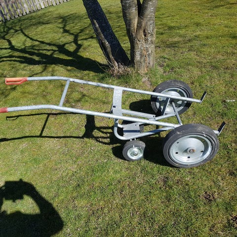 Handtruck med metallram och hjul för transport av tunga föremål. Konstruktion i metall med två hjul och handtag för enkel hantering.
