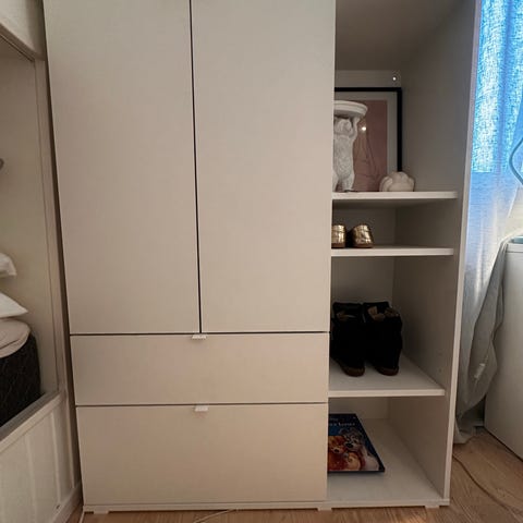 En ikea stuva barngarderob. Tre lådor och en stort skåp med två trådkorgar och en hängare.