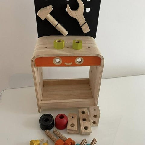 Barnleksak Verktygsbänk i trä med olika färgade knappar och verktyg som hammare, skruvmejsel, måttstock och borrmaskin.