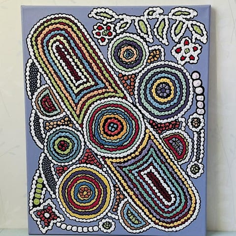 Färgglad abstrakt konsttavla med motiv av flera figurer i olika färger och former. Tavlan är inramad och har en livfull och dynamisk design som kan användas som väggdekoration i bostäder eller kontor.