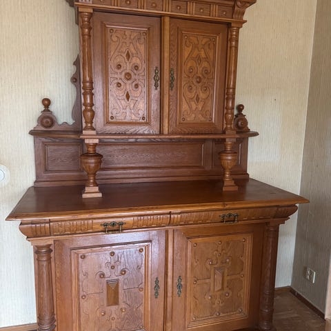 Ett par antika skåp i massiv ek, ca 1890–1910, i klassisk belgisk/fransk Henri II-stil.