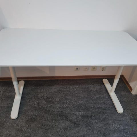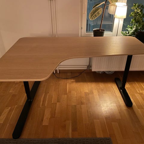 Fint och smidigt hörnskrivbord. Höjden kan ställas in med verktyg. Ihopmonterat, ev isär montering sköts av köparen. Kan bistå med att hjälpa att bära ut.