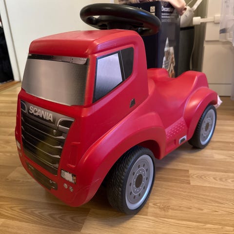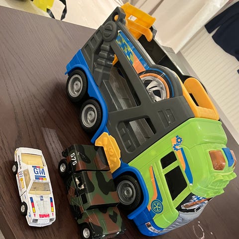 Leklastbil i plast med två små bilar i blått och vitt. Leksaken är färgglad och lämplig för små barn, främst avsedd för lek och utveckling av motoriska färdigheter. Trucken ger ljud- och ljuseffekter. Hämtas i Stora Essingen (Stockholm)
