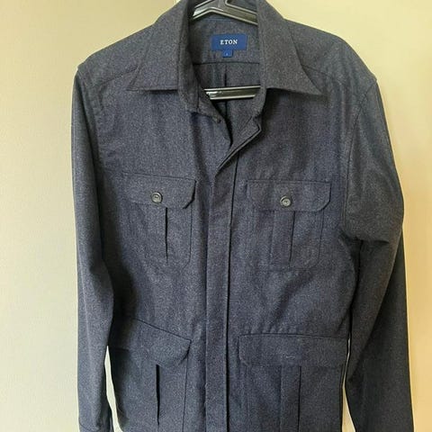 Varm blå ulljacka med stående krage, tillverkad i Italien. storlek 52 och har en huva som göms I kragen. Den är klart använd men har inga defekter.