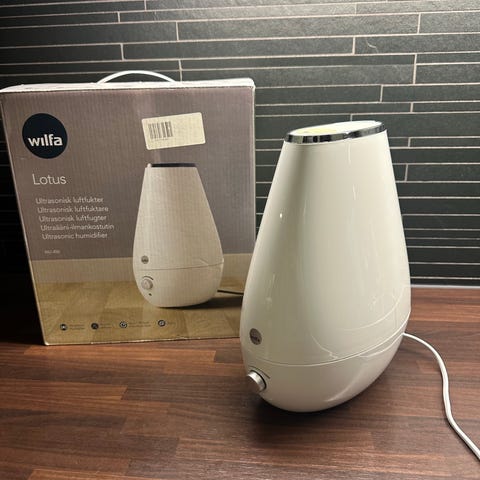 Wilfa luftfuktare med justerbar inställning. Enhet i grå och vit färg med vridreglage för kontroll. Elektrisk modell med sladd för anslutning. Knappt använd.
