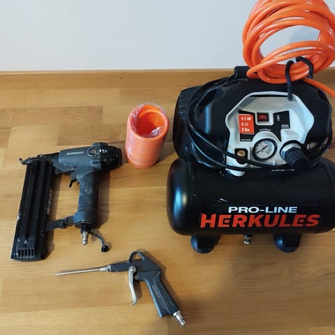 kompressor med 2 kW motor sparsamt använd och fungerande passar perfekt till verkstad byggarbete osv med tryckmätare och slangar följer med.