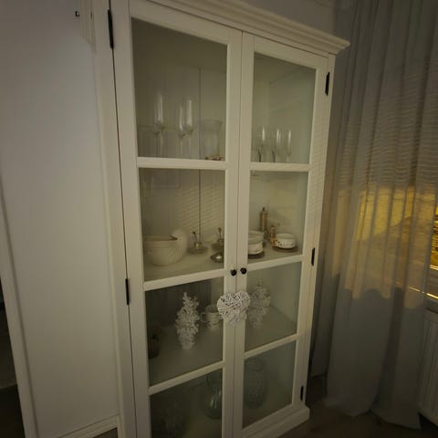 Jysk vitrinskåp med glasdörrar och en låda i vitt utförande. Skåpet har två glasdörrar med rutmönster och en nedre låda för förvaring. Passar för förvaring och visning av föremål i hemmet.