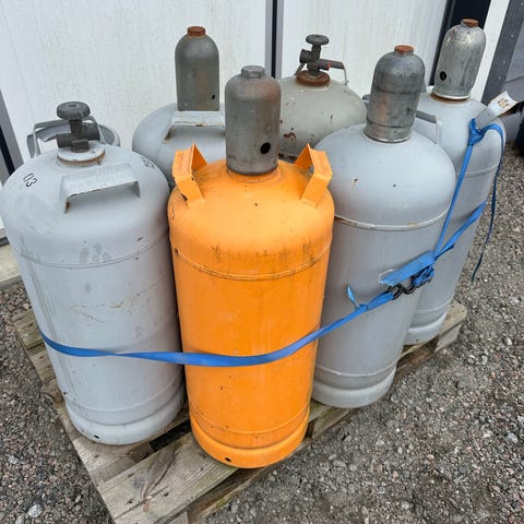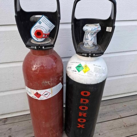 2 st 20 literstuber Oxygen och Acetylen som är fyllda plus en liten kärra.