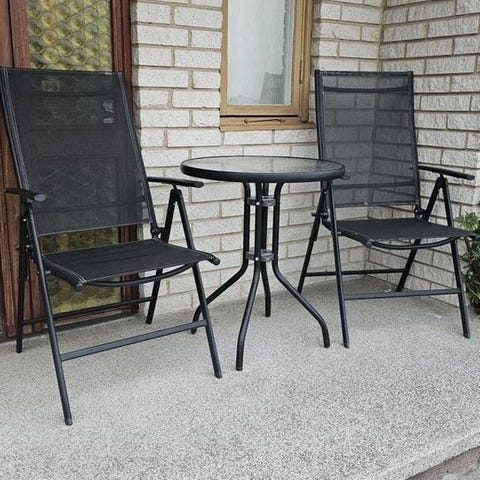 Utemöbelset bestående av flera delar inklusive ett vitt bord med svarta ben, vita hopfällbara stolar i metall, två svarta vilstolar med textilmaterial, två gröna trästolar och en svart bänk. Möblerna är avsedda för utomhusbruk och varierar i design och material.