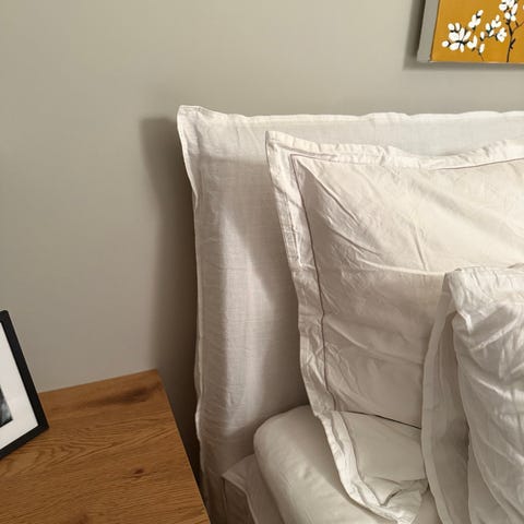 Sänggavel i linne, måtten 160x125cm. Fin färg i beige.