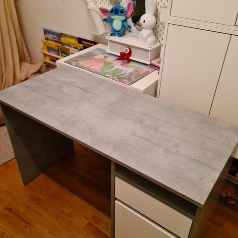 Säljer skrivbord från Jysk med en rymlig låda för papper och kontorsmaterial.