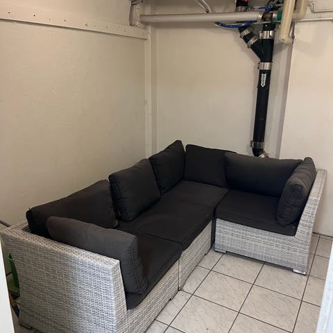 Möblerna är i fint skick, ena dynan har dragkedjan gått sönder på, men syns ej tack vare ryggkuddarna. (Se bild)