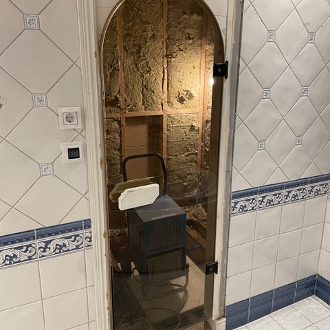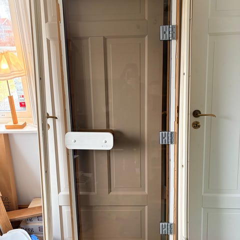 Glasdörr (Tylö) för bastu med trähandtag. Dörren är mörktonad och har gångjärn för montering. Passar för installation i basturum.