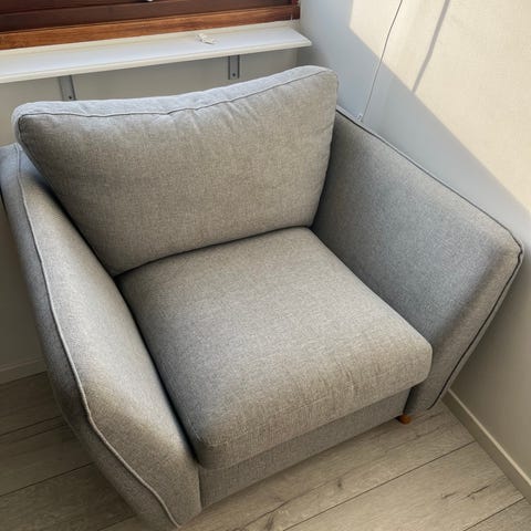 Tygklädsel. Sittdyna med pocketfjädrar och skumstoppning. Ryggdyna i skum. Med elektriskt styrd, steglös lutningsmekanism och inbyggt benstöd. B78 x H111 x D97 cm