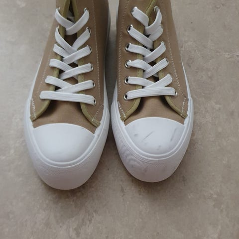 Ett par jättefina och snygga basic sneakers i storlek 40 köpt secondhand (i samma skick) för ca 399kr, jag har använt dom 1 gång så i fint/bra skick! Dom är väldigt liten i bredden och avlång i modellen, säljs pga att dom var trånga på mig. Står tyvärr inget märke i dom så vet inte vart dom är ifrån.