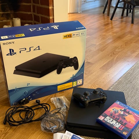 FRI FRAKT! Dags att sälja min PlayStation 4 Slim med 12 spel & 1 handkontroll. Självklart även med tillhörande kablar. Se bilden för de medföljande 12 spelen - en ordentlig variation! Konsolen, handkontrollen, kablarna och spelen är alla i mycket bra skick. Placeras i kartong (ej original) med skyddande emballage. Ursprungligt annonspris: 2700 kr.