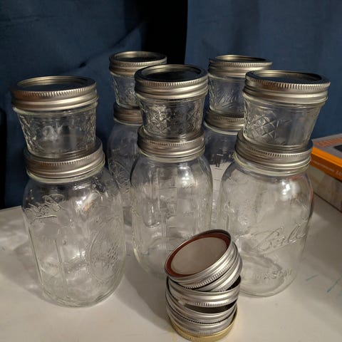 Komplett inläggningsset för seriös konservering. Burkar köpta på Clas Ohlsson, bara använt ett fåtal av dem vid ett tillfälle.