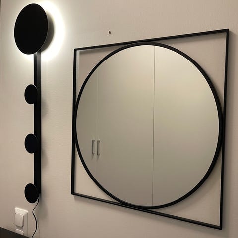 Väggspegel med antik design och dekorativ ram i metall. Två lampetter med glas i tonad grön och gul färg, formade som blomblad. Passar som väggdekoration och belysning i klassiska eller vintage-inredda miljöer.