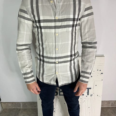 Burberry skjortor i blå färg, storlek S för herr. Tillverkad i bomullsmaterial. Skjortorna har knappar framtill och en krage.