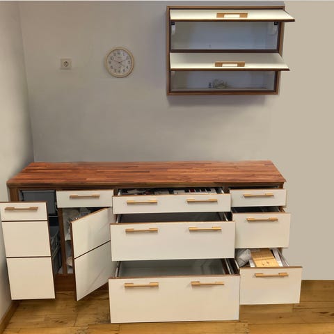 I vitrinskåpen är der 2 glashyllor i varje, kom inte med på bild.
