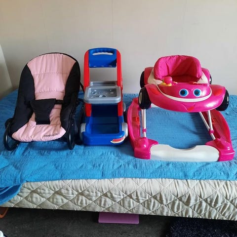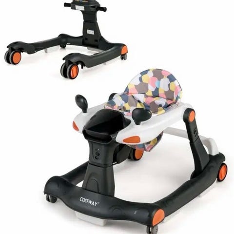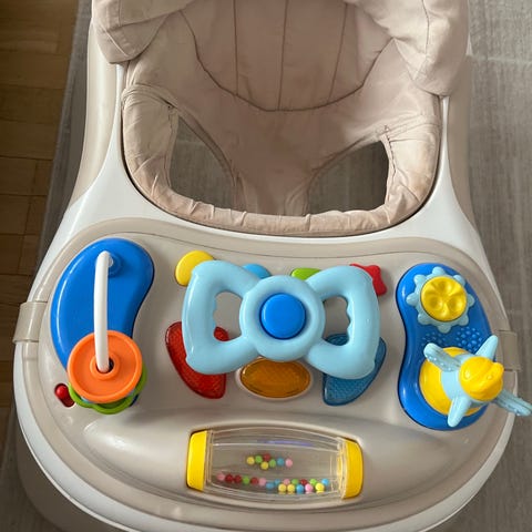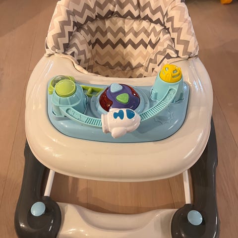 En mycket fin gåstol/gåvagn, finns olika lägen. En liten konsoll/ratt som går att ta av som gör massa ljud, spelar musik och låter som en bil. Går att ha konsolen på eller hela bilen på när barnet går, eller bara själva stolen.