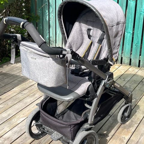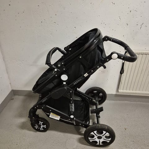 Barnvagn med beige klädsel och justerbart handtag. Utrustad med sittdel och liggdel, samt bilbarnstol. Alla tre kan användas på chassit. Har hjul för smidig förflyttning och en mugghållare. Finns även åkpåse, regnskydd, extra sittdyna och en justerbar liggläge. Tillkommer även en ställning för liggdelen med små hjul man kan ha hemma. Lämplig för barn 0-5 år och erbjuder en bekväm och säker transportmöjlighet.