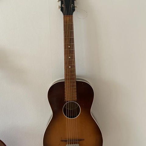 Trevlig gitarr för att kompa visor. Jag har den strängad med stålsträngar, men det sägs att den funkar med nylonsträngar också.