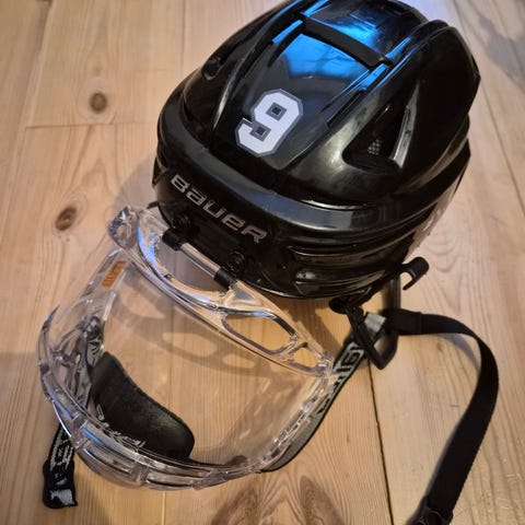 Bauer ishockeyhjälm med svart färg och medföljande svart galler. Hjälmen är anpassad för ishockey och erbjuder skydd för huvudet och ansiktet under spel. Gallret är en av de lättare varianterna. Hjälmen har använts ca 5 ggr. Priset går och diskuteras