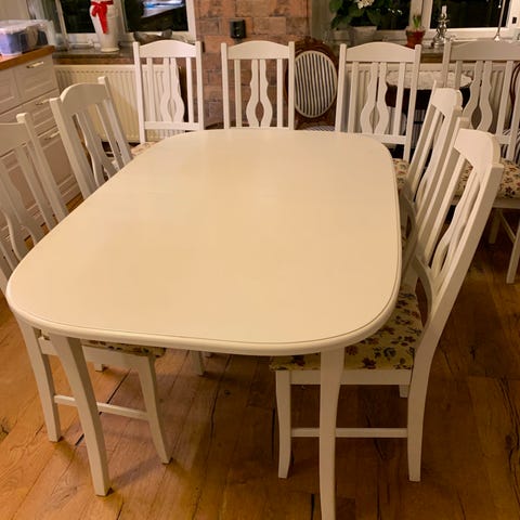 Bordet är i väldigt fint skick, några stolarna har små tecken på användning i tyget men inget som syns särskilt mycket.