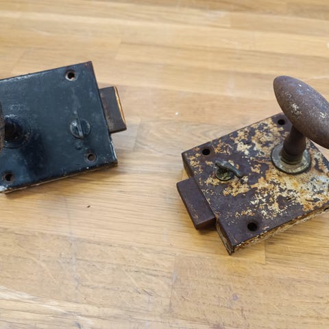 Antik trädörr med original lås och nyckel i metal. Passar för renoveringsprojekt eller som dekorativ detalj i äldre byggnader.