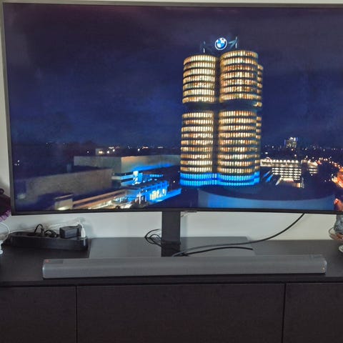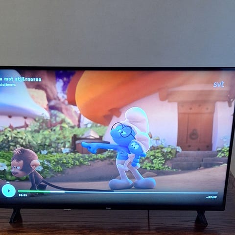 TV med surround system inklusive högtalare och subwoofer. Systemet är svart och avsett för hemmabio eller förbättrad ljudupplevelse vid TV-tittande.