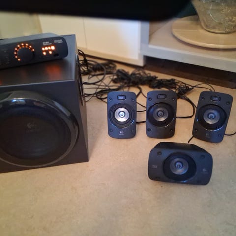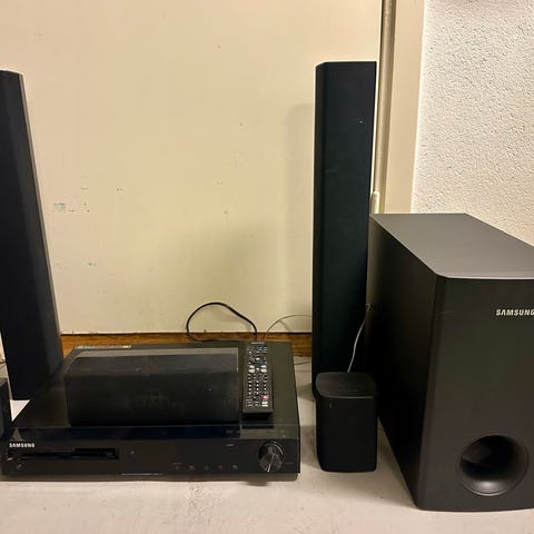 Samsung högtalarsystem med subwoofer. Systemet består av en subwoofer och mindre högtalare för ljudåtergivning vid tv‑ eller musikuppspelning.