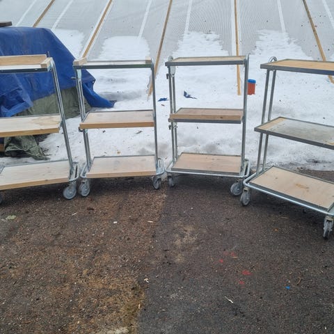 Fyra stycken varuvagnar. Bra att använda till att förvara och stapla lådor med grejer i. Fungerar även perfekt till att exempelvis ha ved i som en del använder sådana vagnar till.