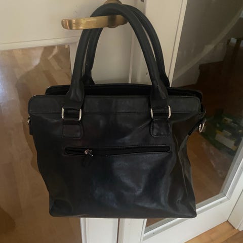 Långa axelremmar, det fanns tidigare korta handtag med de klippte jag bort. Syns fortfarande högst upp på väskan att ytterligare remmar funnits. Axelremmarna är gjorda av två skinnremmar som klistras ihop och de har börjat släppa från varandra. Går säkert att klistra ihop igen men jag säljer väskan i befintligt skick.