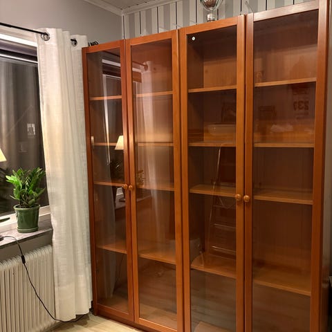 En av bokhyllorna med glasdörrar har hål i ryggen i nedre sektionen då antingen uttag suttit där eller att man velat dra sladdar därifrån till något annat.