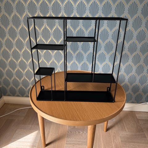 Hyllsystem med tre hyllplan i trä och metall