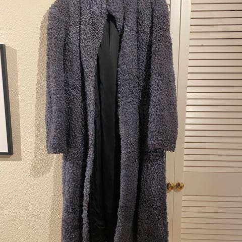 Fårskinnspäls st s-m. Fodrad. Bra skick men har hängt länge i en garderob. Huva. Lång kappa.