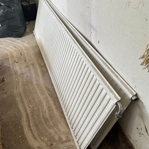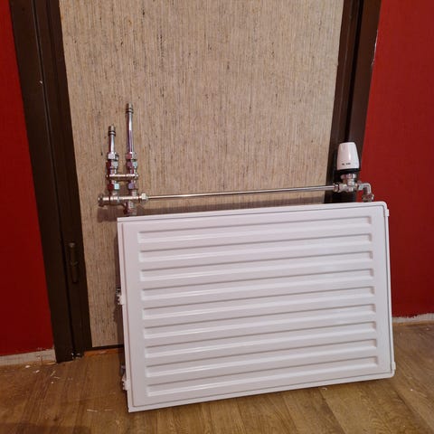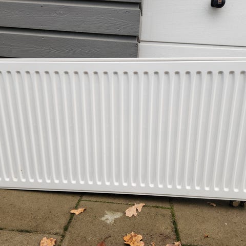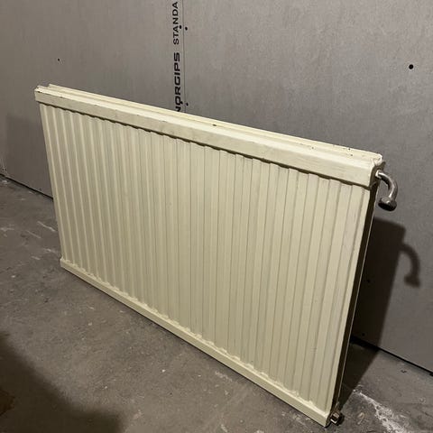 Radiator med termostatventil och beslag för fönstermontering. Vit färg och standardmått för uppvärmning i bostadsmiljö.102 cm lång och 50 cm bred. Hämtas i Skene.