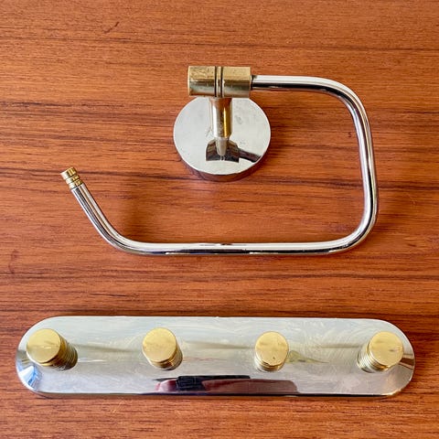Mycket praktisk toalettpappershållare. Stativ för extra rullar. Stabil och golvstående, inga skruvar i väggen. I mycket fint skick.