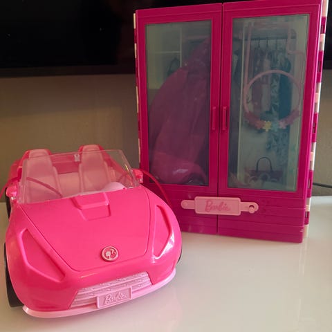 Barbie dockor och tillbehör set med flera olika dockor i olika kläder och stilar. Setet inkluderar också möbler som garderob, säng och andra små tillbehör i rosa och vitt. Innehåller även en gravid Barbie docka. Material i plast och textil.