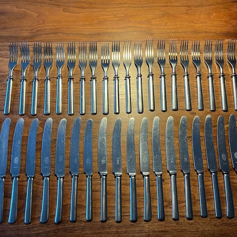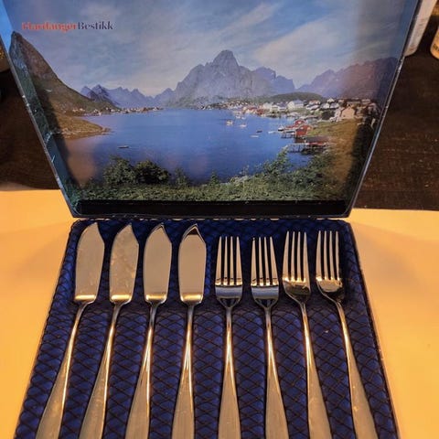 Fiskbestick i alpacka/nysilver, 6 gafflar, 6 knivar samt druvsax.
