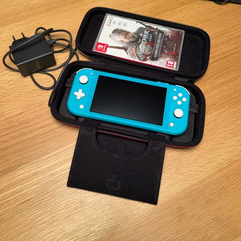 Nintendo Switch handhållen spelkonsol i turkos färg. En bärbar enhet för spel med pekskärm och inbyggda kontroller.